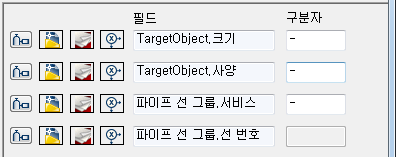 다음은 선 세그먼트의 태그를 수정하는 데 사용되는 대화상자의 일부입니다. 기본적으로 이 태그는 선 세그먼트 자체의 특성(크기 및 사양) 및 파이프 선 그룹의 특성(서비스 및 선 번호)을 포함합니다.