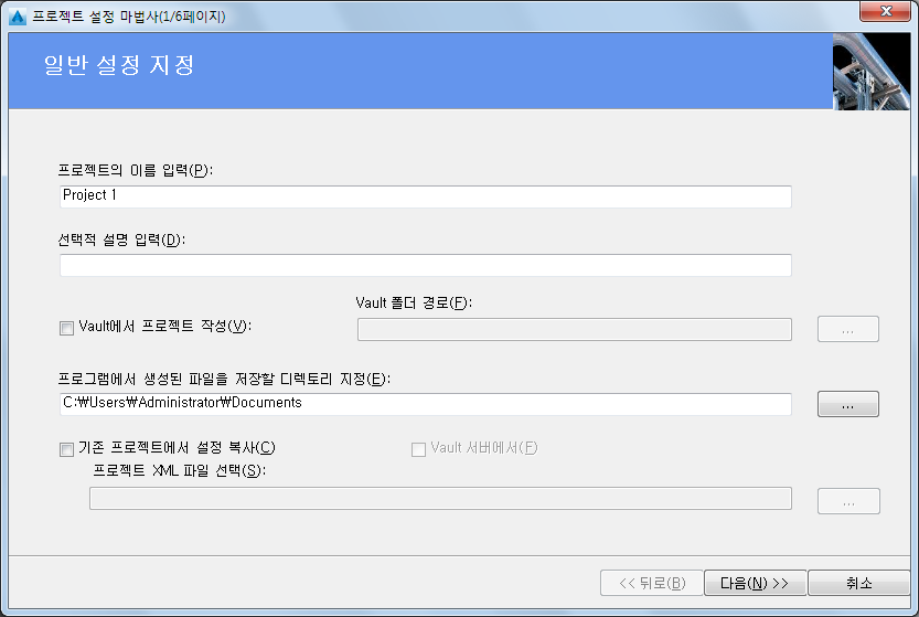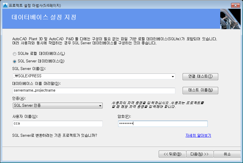 주: 프로젝트 설정 마법사에 복수 사용자 성능 및 안정성을 개선하기 위해 서버 기반 데이터베이스를 사용할지 여부를 지정하는 페이지가 포함되어 있습니다. 이 옵션을 선택하려면 먼저 Microsoft SQL Server Express 또는 Microsoft SQL Server를 설치해야 합니다.