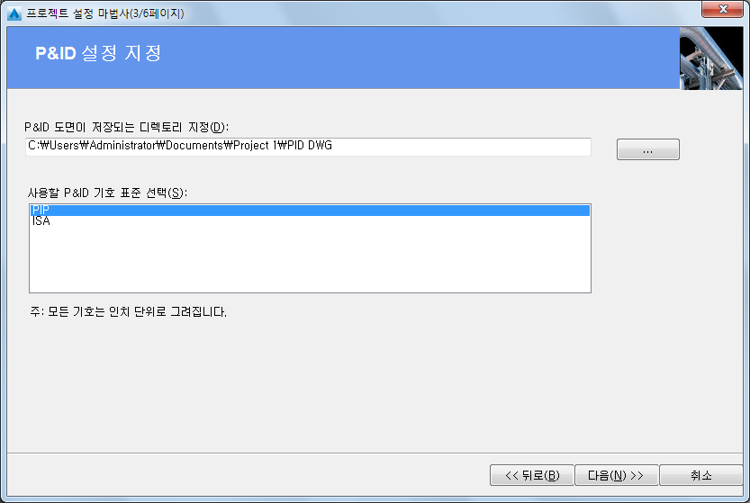 - 프로젝트 설정 마법사(3/6페이지)에서 P&ID 도면의 경로를 입력하거나 P&ID 도구 팔레트 컨텐츠의 표준을 선택합니다. 다음을 클릭합니다.
