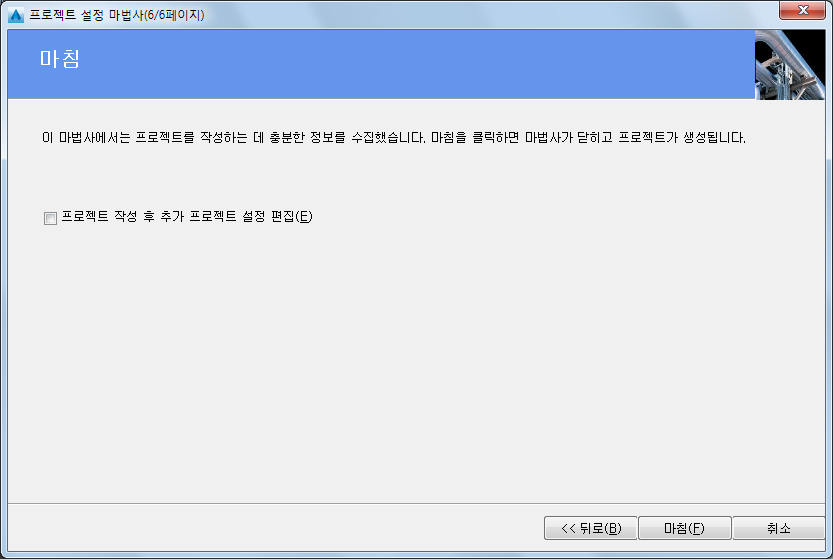 - 프로젝트 설정 마법사(6/6페이지)에서 기본 프로젝트 설정을 변경하려면 프로젝트 작성 후 프로젝트 특성 편집 확인란을 선택합니다. 마침을 누릅니다.