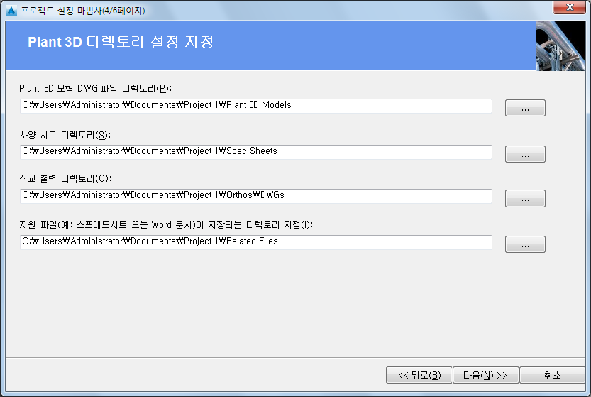 - 프로젝트 설정 마법사(4/6페이지)에서 모형, 사양 시트 및 직교의 경로를 입력합니다. 다음을 클릭합니다.