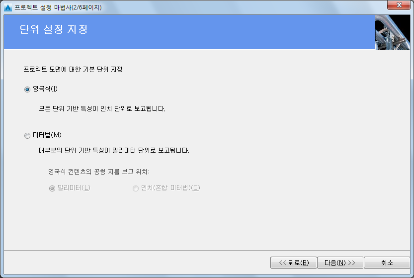 - 프로젝트 설정 마법사(2/6페이지)에서 프로젝트가 영국식인지 또는 미터법인지 지정합니다. 미터법을 선택한 경우 영국식 컨텐츠의 공칭 지름 단위를 지정합니다. 다음을 클릭합니다.