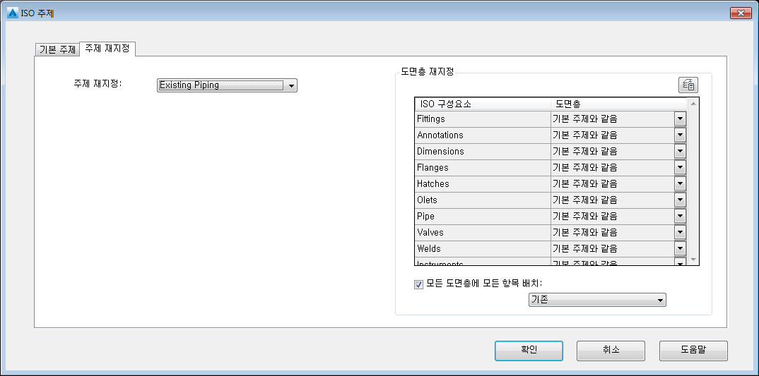 각 ISO 구성요소를 표시할 도면층을 지정합니다. 기본적으로 모든 도면층은 기본 주제와 같음으로 설정됩니다. 구성요소 리스트에는 부속품, 플랜지, 해치, 단열재, 기기, 파이프, Olet 및 밸브가 포함됩니다. 테이블과 같은 전역 구성요소)는 제외됩니다.