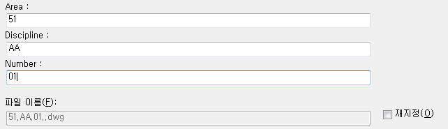 - 새 파일 이름을 지정합니다. 원래 파일 이름이 파일 이름 형식(예: - 구분자로 구분된 영역, 분야 및 번호가 결합된 형식)을 사용하여 작성된 경우 DWG 이름 바꾸기 대화상자에 다음 필드가 제공됩니다.