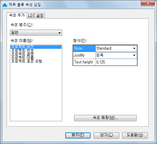 LDT 설정 탭(제목 블록 속성 삽입 대화상자)