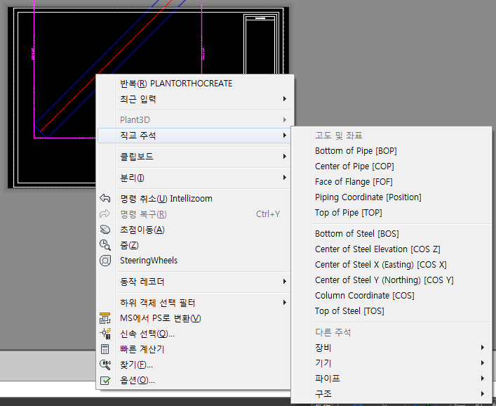 메뉴에서 직교 주석을 클릭합니다. 원하는 주석(예: 파이프의 맨 아래 [BOP])을 클릭합니다.