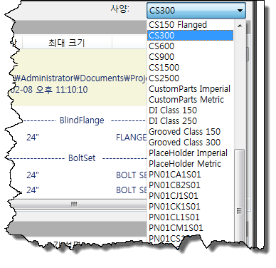 사양 뷰어의 사양 리스트에서 파이프 사양(예: CS300)을 클릭합니다.