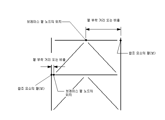 옵션을 선택한 후 시작 부착 비율 또는 시작 부착 거리의 값을 입력합니다. 가새 시작점이 기둥에 배치된 경우 가새의 끝에 대해 이 옵션을 사용할 수 없습니다.