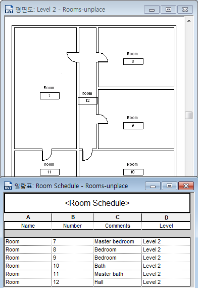 룸 배치를 취소한 후 일람표를 사용하여 건물 모델에서 위치를 조정해야 하는 룸 리스트를 생성합니다.