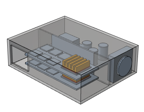 조립품에는 동일한 두 가지 PCB(인쇄 회로 기판)가 있습니다. 각 PCB에는 알루미늄 열 싱크로 냉각되는 칩이 있습니다. 열 싱크는 열 싱크와 동일한 외곽 크기의 솔리드 알루미늄 스페이서를 사용하여 칩에 부착됩니다.