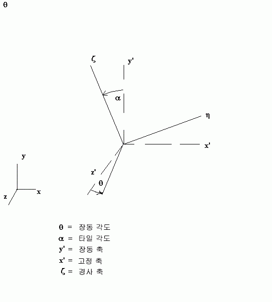 위 이미지에서는 장동 동작을 설명합니다. 사용자 인터페이스를 통해 정의되는 세 가지 수량은 경사 축, 장동 축 및 장동 중심입니다.