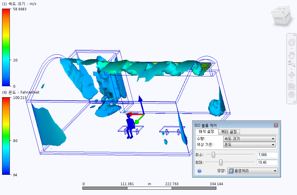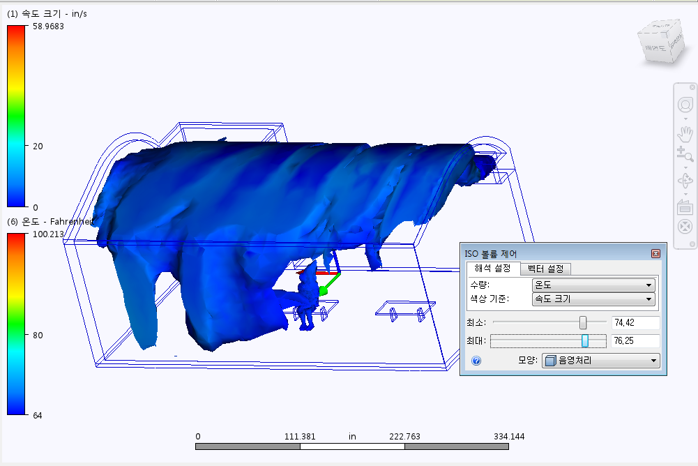 수량은 ISO 볼륨의 쉐이프를 결정하는 스칼라 결과입니다. 결과별 색상 수량은 체적의 색상을 결정합니다. 기본적으로 색상은 동일합니다. 두 결과를 함께 표시하려면 다른 스칼라 결과를 선택합니다. 예로는 온도를 수량으로 선택하는 경우와 속도 크기를 결과별 색상으로 선택하는 경우가 있습니다. 이렇게 하면 지정된 속도 크기 범위 내에 있는 모형의 모든 위치에 온도가 표시됩니다.