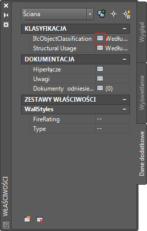 - Na palecie właściwości, na karcie Dane dodatkowe, na panelu Klasyfikacja kliknij opcję IfcObjectClassification i wybierz klasyfikację.