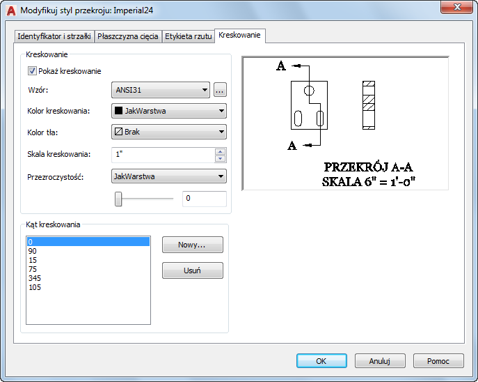 Ustala listę kątów do wykorzystania przez kreskowania w przekroju. Pierwszy komponent w przekroju korzysta z pierwszej pozycji na liście, drugi komponent z drugiej itd. Na liście musi znajdować się co najmniej jeden kąt.