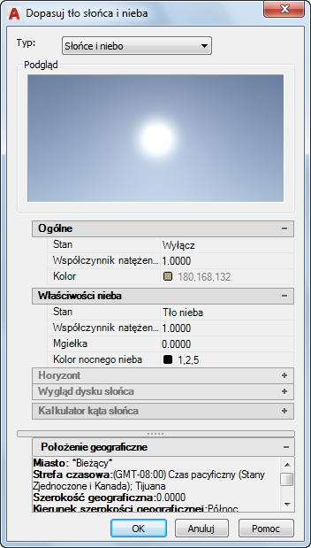 Definiuje położenie, kolor i efekty słońca i nieba dla widoku.