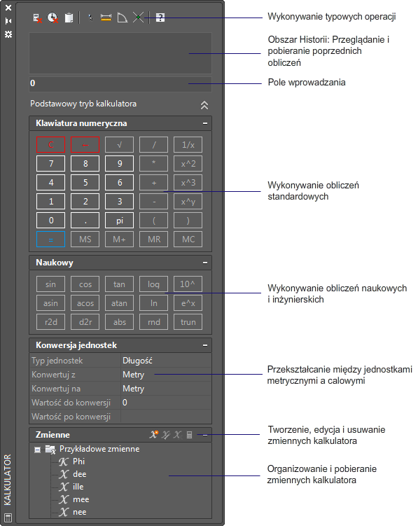 Kalkulator oprócz podstawowych funkcji występujących w kalkulatorach naukowych zawiera funkcje geometryczne, konwersje jednostek i zmienne.