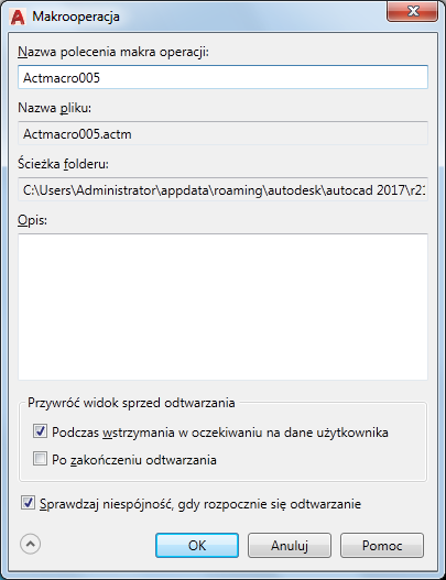 Określa, czy makro operacji ma być skanowane pod kątem niespójności między bieżącym stanem rysunku a stanem rysunku w czasie rejestrowania makra.