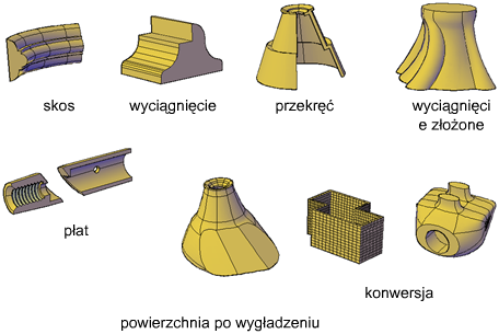 W wyniku wybrania zamkniętej krzywej i wykonania wyciągnięcia prostego, przeciągnięcia, wyciągnięcia złożonego lub obrócenia obiektu tworzone są odpowiednio: