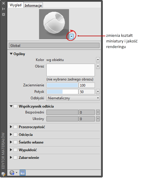 Edytuj istniejący materiał (dostępny w bibliotece Autodesk Material Library) lub rozpocznij od materiału ogólnego. Wprowadzane zmiany są wyświetlane w podglądzie próbki materiału. Można zmienić kształt obrazu wyświetlanego w podglądzie.