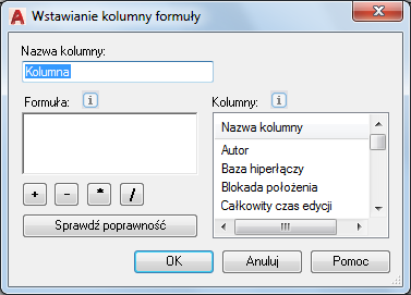 Sprawdza poprawność określonego równania. Kolumnę formuły można wstawić tylko wtedy, gdy zostanie sprawdzona poprawność formuły.