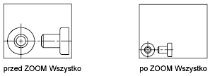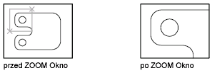 Widok można zmniejszać i zwiększać za pomocą polecenia Zoom, które działa podobnie jak opcja przybliżania i oddalania w aparacie fotograficznym. Użycie funkcji ZOOM nie powoduje zmiany bezwzględnej wielkości obiektów w rysunku. Zmienia tylko powiększenie widoku.