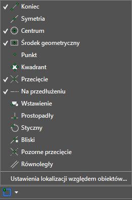 Tryby lokalizacji względem obiektu służą do dokładnego określania lokalizacji na obiektach za każdym razem, gdy w trakcie polecenia jest wyświetlany monit o określenie punktu.