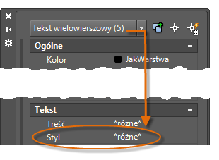 Wskazówka: Aby określić styl tekstu używany w jednym lub wielu wybranych obiektach tekstu wielowierszowego, można użyć palety Właściwości. Przykładowo po wybraniu pięciu uwag, w których używane są różne style, kliknij kolumnę Styl i wybierz styl z listy.