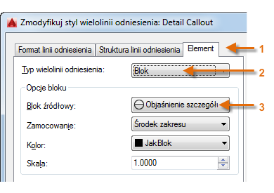 Aby na przykład utworzyć styl „objaśnienie szczegółu”, uruchom polecenie WIELOLODNSTYL. W oknie Menedżer stylów wielolinii odniesienia kliknij przycisk Nowy i wybierz opisową nazwę nowego stylu wielolinii odniesienia. Kliknij kartę Element i wybierz Blok, a następnie Objaśnienie szczegółu, jak pokazano na rysunku.