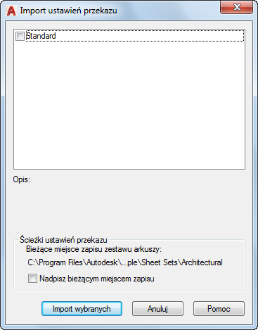Wyświetla listę ustawień przekazu. Należy zaznaczyć te, które mają być zaimportowane do bieżącego zestawu arkuszy.