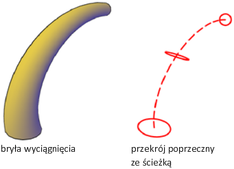 - Ścieżki. Określ ścieżkę dla operacji wyciągnięcia złożonego, aby zapewnić lepszą kontrolę nad kształtem obiektu poddawanego operacji wyciągania złożonego. Aby uzyskać najlepsze efekty, należy krzywą definiującą rozpocząć na płaszczyźnie pierwszego przekroju poprzecznego, a zakończyć na płaszczyźnie ostatniego przekroju poprzecznego.