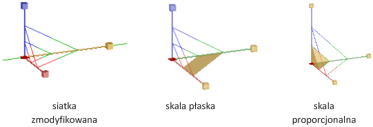 Skalowanie niejednorodne (wzdłuż osi lub płaszczyzny) jest dostępne tylko dla siatek. Nie jest ono dostępne dla brył ani powierzchni.