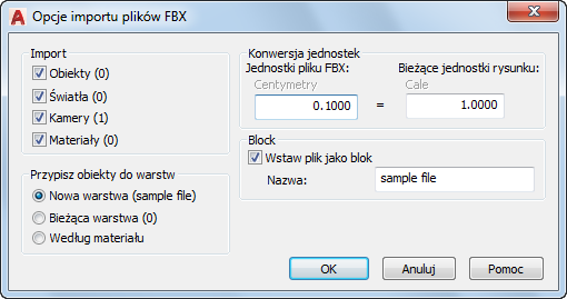 Umożliwia określenie elementów do zaimportowania, sposobu przypisywania warstw do importowanych obiektów, jednostek konwersji oraz tego, czy plik FBX ma być importowany jako blok.