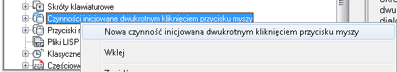 1. Na karcie Dostosuj, w panelu Dostosowywane pliki: <nazwa pliku> kliknij prawym przyciskiem myszy węzeł Czynności inicjowane dwukrotnym kliknięciem przycisku myszy. Kliknij pole Nowa operacja inicjowana dwukrotnym kliknięciem przycisku myszy.