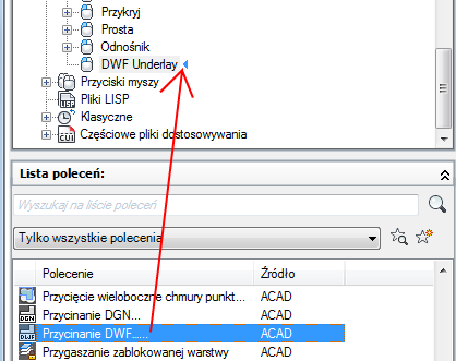 5. Jeśli chcesz zastąpić bieżące polecenie przypisane do operacji inicjowanej dwukrotnym kliknięciem przycisku myszy, przeciągnij polecenie z panelu Lista poleceń do operacji inicjowanej dwukrotnym kliknięciem przycisku myszy w panelu Dostosowywane pliki: <nazwa pliku>.