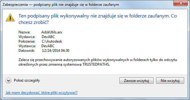 Podczas wczytywania niestandardowego pliku programu, który został podpisany cyfrowo, program AutoCAD sprawdza podpis cyfrowy dołączony do pliku. Wyświetlane jest okno komunikatu z informacją, czy można zweryfikować podpis cyfrowy, co pozwala użytkownikowi wczytać plik do środowiska rysunku albo anulować wczytywanie.