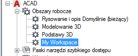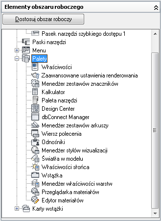 - Na karcie Dostosuj, na panelu Dostosowywane pliki: <nazwa pliku> kliknij znak plusa (+) obok węzła Obszary robocze, aby go rozwinąć.