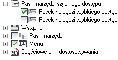 - Na panelu Dostosowywane pliki: <nazwa pliku> kliknij znak plusa (+) obok węzła Paski narzędzi szybkiego dostępu, aby go rozwinąć.