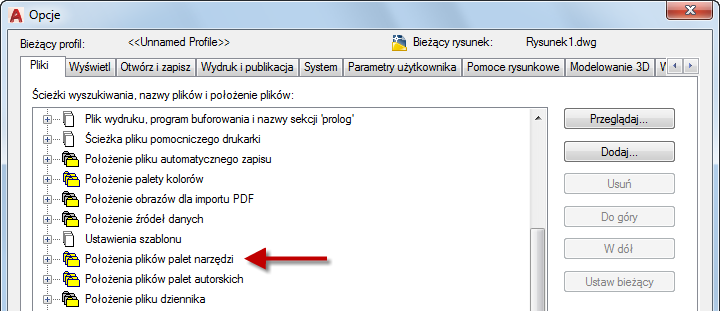 Grupy palet narzędzi są przechowywane w profilu użytkownika. Aby wyświetlić domyślne grupy palet narzędzi, przełącz się do profilu o nazwie <<Profil bez nazwy>> lub <<nazwa produktu — profil bez nazwy>>. (Profile użytkowników nie są dostępne w programie AutoCAD LT).