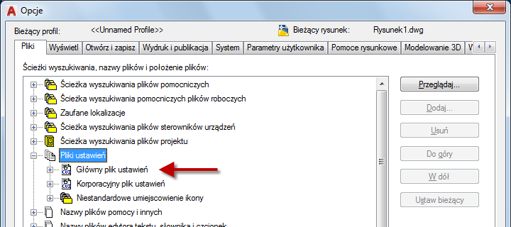 Zmiany wprowadzone w profilach użytkownika są przechowywane w rejestrze systemu Windows i podlegają migracji. Uwaga: Niedostępne w programie AutoCAD LT.