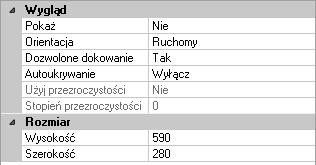 Uwaga: Aby określić, że okno powinno być zakotwiczone, ustaw orientację jako lewo, prawo, góra lub dół i włącz opcję ukrywania automatycznego.