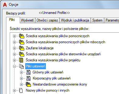- W oknie dialogowym Opcje, na karcie Pliki kliknij znak plus (+) obok pola Pliki ustawień, aby rozwinąć listę.