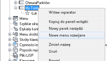 Zostanie utworzony nowy pasek narzędzi (o nazwie Paseknarzędzi1), a nowy przycisk rozwijany odwołujący się niego zostanie umieszczony na dole wybranego paska narzędzi.