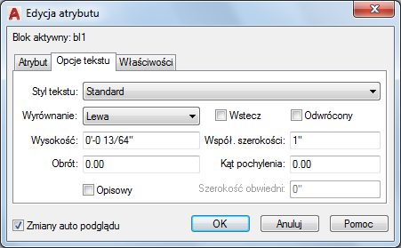 Określa, czy obszar rysunku jest natychmiast aktualizowany w celu wyświetlenia wprowadzonych zmian widocznych atrybutów. Jeżeli opcja Automatyczny podgląd zmian jest zaznaczona, zmiany są natychmiast widoczne. Jeżeli opcja Automatyczny podgląd zmian nie jest zaznaczona, zmiany nie są pokazywane.