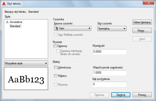 Określa format znaku czcionki, taki jak kursywa, pogrubienie, lub podkreślenie. Wybranie opcji Użyj Big Font powoduje zmianę tej opcji na Nazwa Big Font, która jest używana do wybrania nazwy pliku czcionki Big Font.