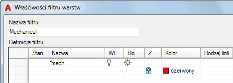 Wyświetla właściwości warstw określające, które warstwy są wyświetlane. W celu zdefiniowania filtru można kliknąć, aby określić jedną lub więcej właściwości. Wszystkie właściwości określone w jednym wierszu w definicji filtru muszą być prawdziwe, aby nazwa warstwy została wyświetlona (logiczne I). Każdy kolejny wiersz w definicji filtru określa alternatywne kryteria (logiczne LUB).