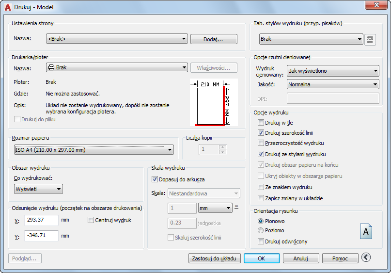 Podczas drukowania z karty Model drukuje cały obszar rysunku zdefiniowany przez granice siatki. Jeśli bieżąca rzutnia nie wyświetla widoku planu, to opcja ta działa tak samo jak opcja Zakres.