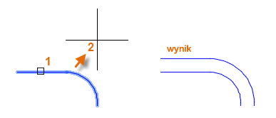 Wybierz obiekt (1), określ odległość odsunięcia i kliknij, aby wskazać, po której stronie pierwotnego obiektu ma się znaleźć wynik (2). Oto przykład odsunięcia polilinii.