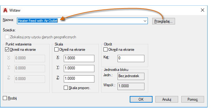 Po pierwszym wstawieniu definicja bloku jest przechowywana w bieżącym rysunku. Od tego momentu można wybrać ją z listy rozwijanej Nazwa bez konieczności klikania przycisku Przeglądaj.