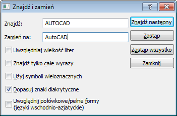 W edytorze tekstu lub z poziomu menu skrótów polecenia WTEKST wybierz opcję Znajdź i zamień