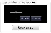 Gdy włączona jest opcja Wprowadzanie przy kursorze (wskaźniku) i aktywne jest jakieś polecenie, współrzędne położenia krzyża nitkowego są wyświetlane w etykiecie narzędzia w pobliżu kursora. Współrzędne można wprowadzić do etykiety narzędzia zamiast do wiersza polecenia.